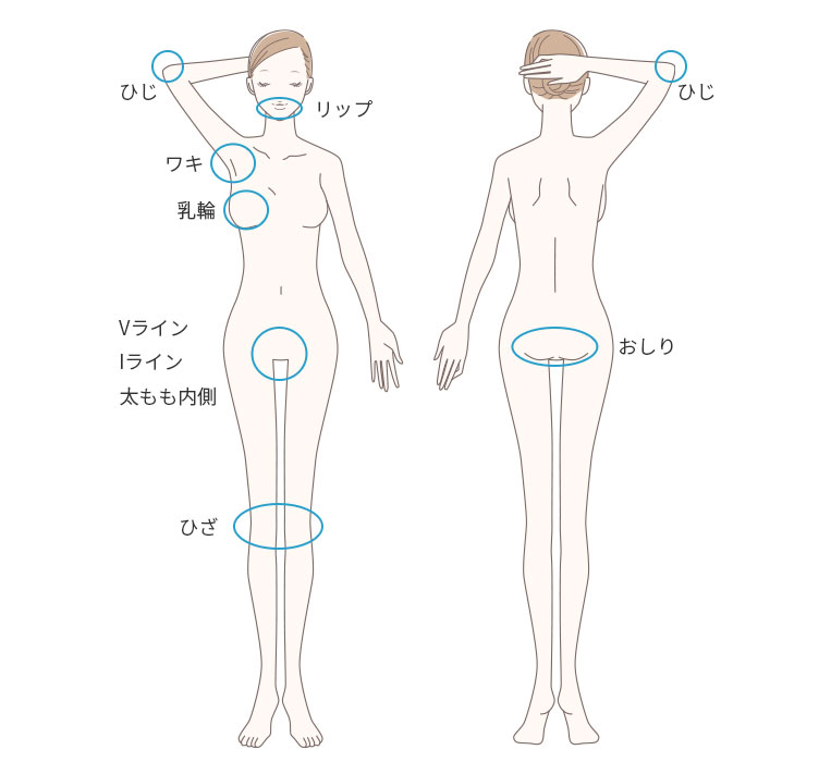 黒ずみが起こりやすいのは、摩擦を受けやすい場所や、皮膚が薄く刺激に弱い部位です。